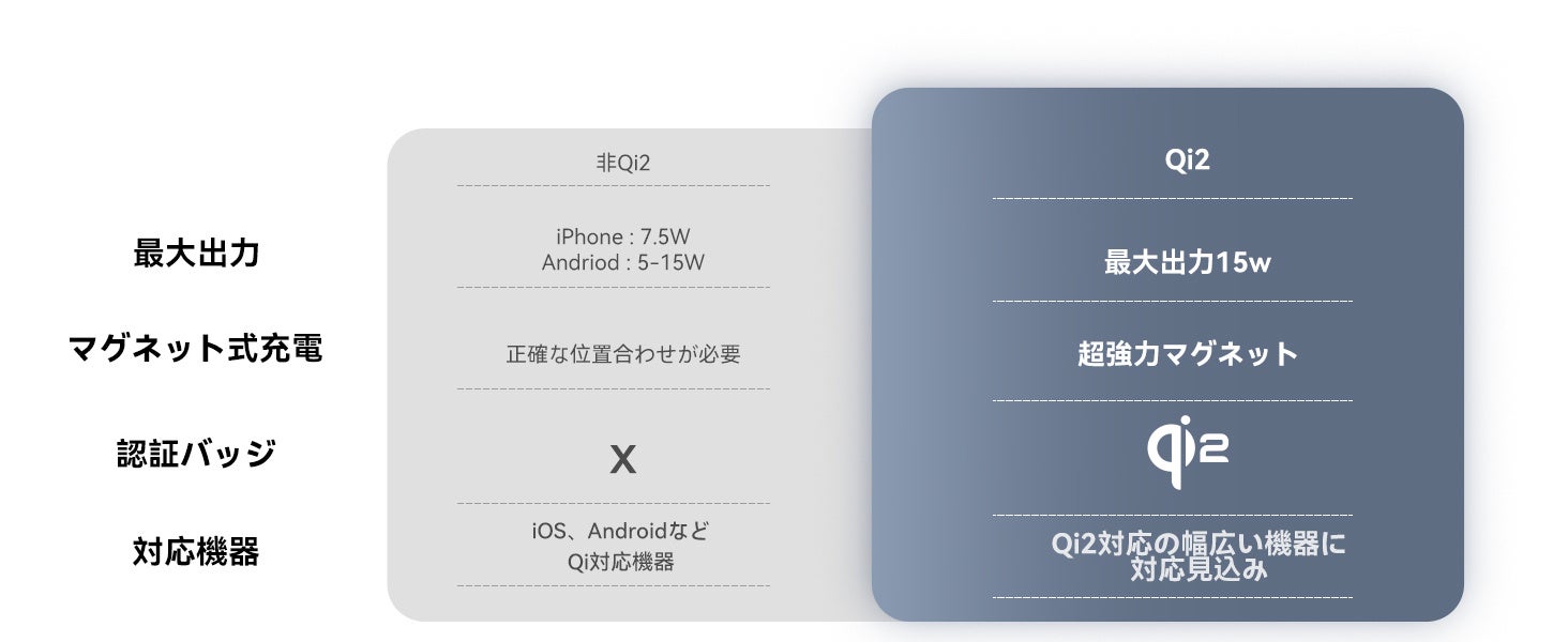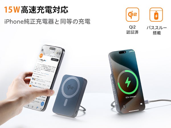 QiはWireless Power Consortium(略称:WPC)によって発表された世界初のワイヤレス充電規格で、利便性と互換性を兼ね備えています。Qiマークのついた製品は、異なるブランド間でのQiワイヤレス充電が可能。今回のOstand スタンド付きの急速モバイルバッテリーはQi2に対応しており、外出先でも他社製品と安全かつ便利に急速充電ができます。これにより、デバイスの互換性を気にせず、iPhone 12以降のMagSafe規格及びQi2対応の幅広い機種で使用可能です。