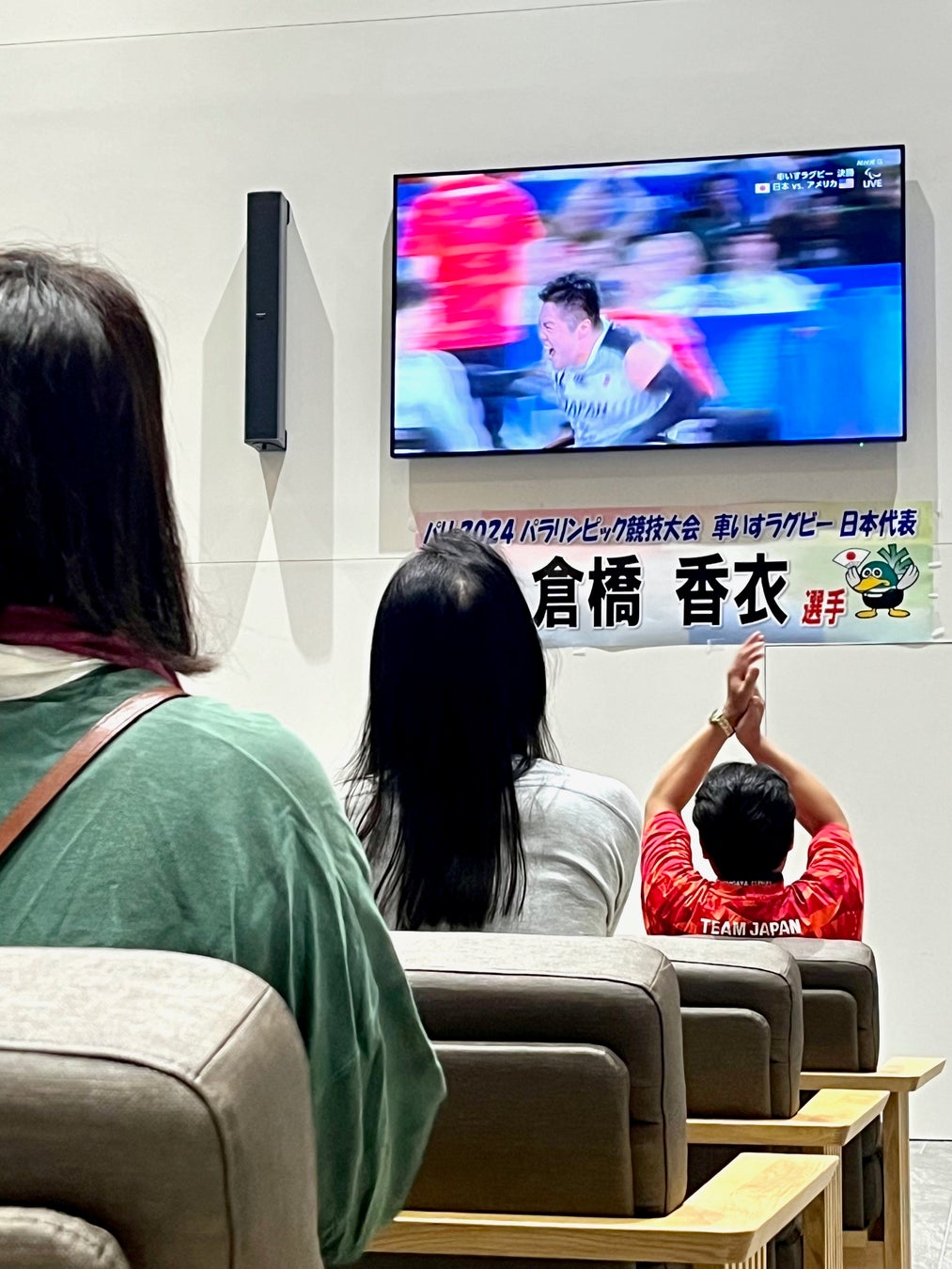 日本代表で越谷市在住の倉橋香衣選手を応援しようと、市役所エントランス棟でパブリックビューイングが開催されました。深夜にもかかわらず集まった市民の皆さんが、勝利に導いた倉橋選手の守備での貢献に大興奮!喜びを分かち合いました。