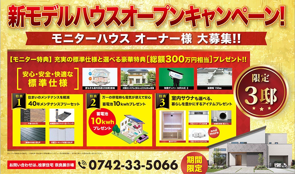新春キャンペーン開幕!限定3邸・総額300万円相当の特典がもらえるモニターキャンペーン!お得なチャンスをお見逃しなく!