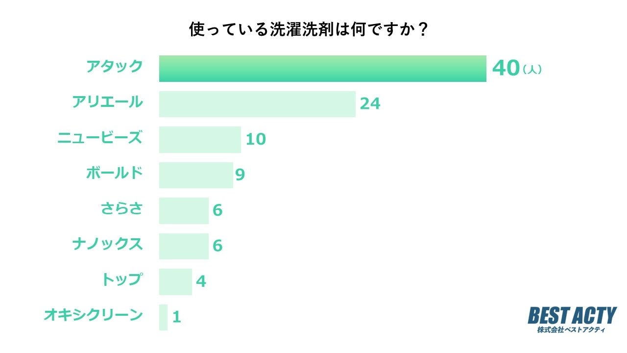 使っている洗濯洗剤について100人にアンケートを行ったところ、「アタック」と回答する人が最も多い結果となりました。