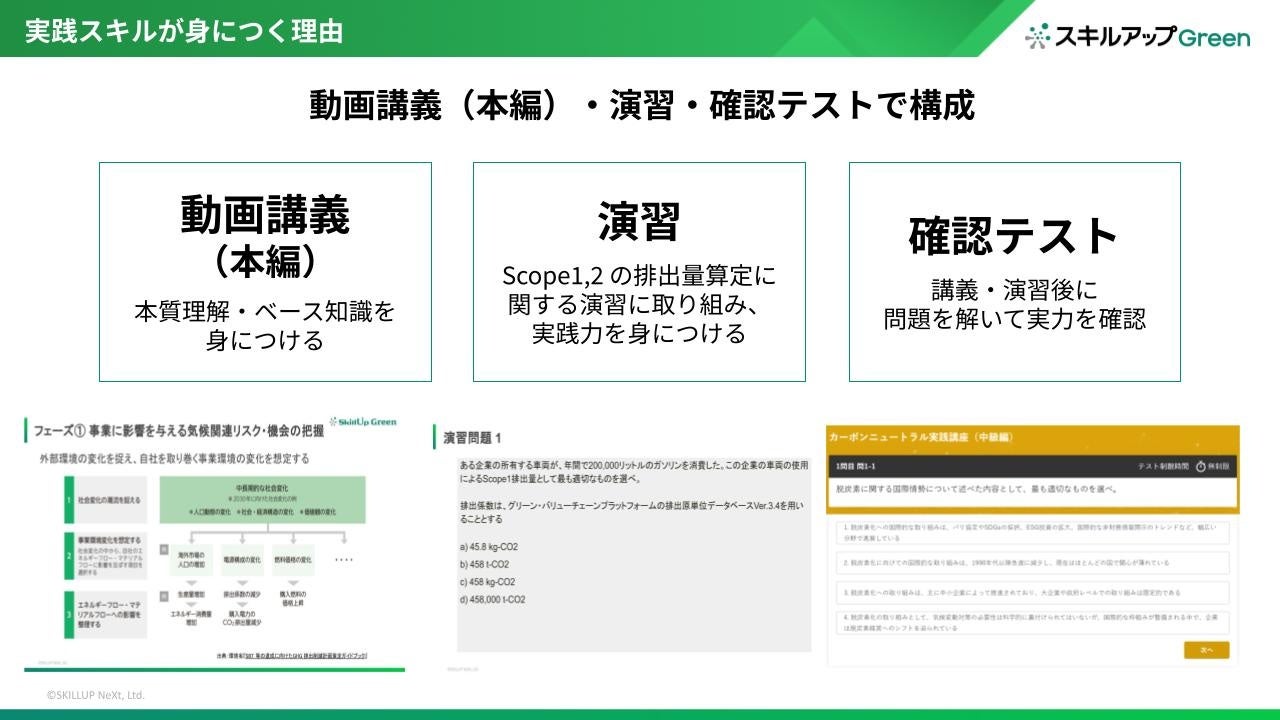 GX検定アドバンストの対応講座では、動画講義の他に演習と確認テストを提供しています。動画講義で知識を身につけながら、演習でScope1および2の排出量算定に実際に取り組み、さらに確認テストで実力を確認することで、企業の脱炭素経営を推進する実践スキルを習得することができます。
