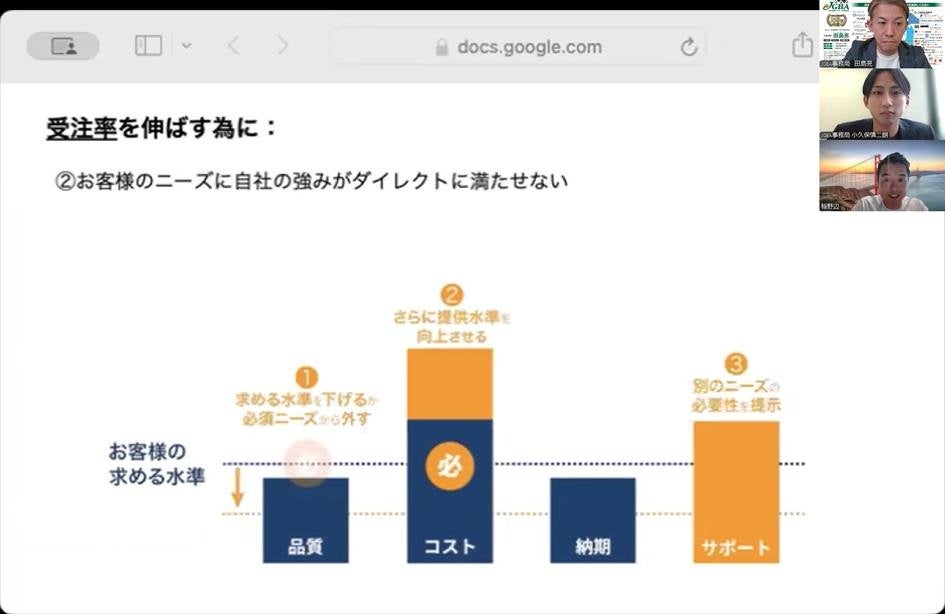 「リアル」にこだわった学びの機会を積極的に提供しているJGBAでは、会員企業の更なる情報共有と交流機会創出のため、2021年からリアルやオンライン、コラボなど様々な形でのセミナー・勉強会や住宅会社現地視察会などを開催。2024年は住宅会社視察会を4カ所開催。勉強会では「毎年5~10棟 地域密着安定受注実践会」や「工務店アフター実践会」、「工務店向け組織力強化セミナー」、「住宅営業マンが確実に月1棟以上の契約を上げるための『8×4=32の法則』~優秀営業マンの頭の中を体系化~」「外構で集客・成約率が変わる!家が売れるエクステリアセミナー」など、様々なテーマや切り口でセミナーを開催。知見やノウハウをアップデートする機会を提供してきました。10月31日(木)には、世界屈指のITプラットフォーム企業のグーグルで事業責任者を担った稲野辺俊樹氏が「外資流営業チーム作り」を解説するオンライン限定セミナーを開催し、会員・未会員併せて40名の方に参加いただきました(未会員は一部視聴限定)。