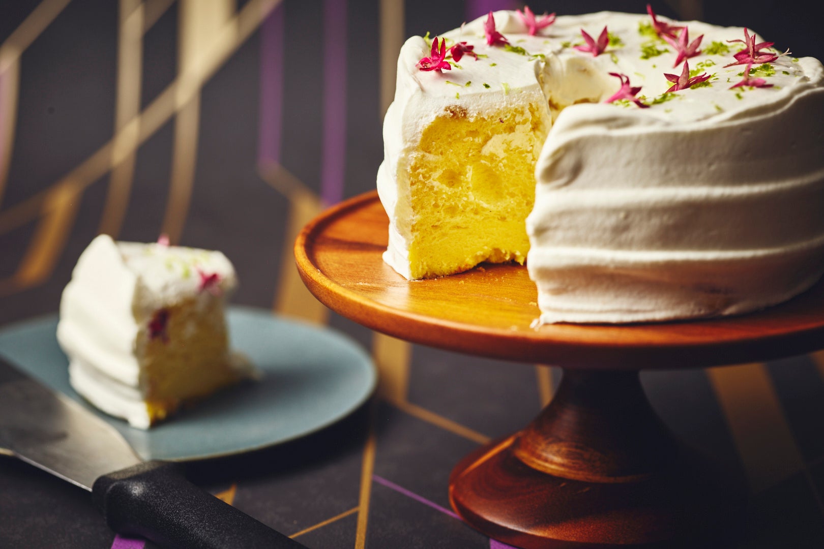 柚子香るふわふわのシフォンケーキを、ホイップクリームの上品な甘さと、いちごとルバーブのジャムがもたらす甘酸っぱさで優しく包み込みます。愛らしい花で彩られたカットケーキは、つい写真に収めたくなるほどの華やかさです。