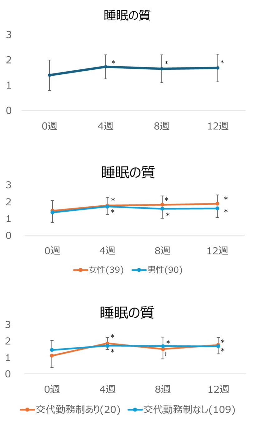 本調査では、「ネスレ ヘルスサイエンス睡眠プログラム」を開始した後、4週、8週、12週で睡眠の質の有意な改善が確認されました。また、性別毎および交代勤務制であるか否かを問わず、「ネスレ ヘルスサイエンス睡眠プログラム」の実施によりプレゼンティズムが改善しました。