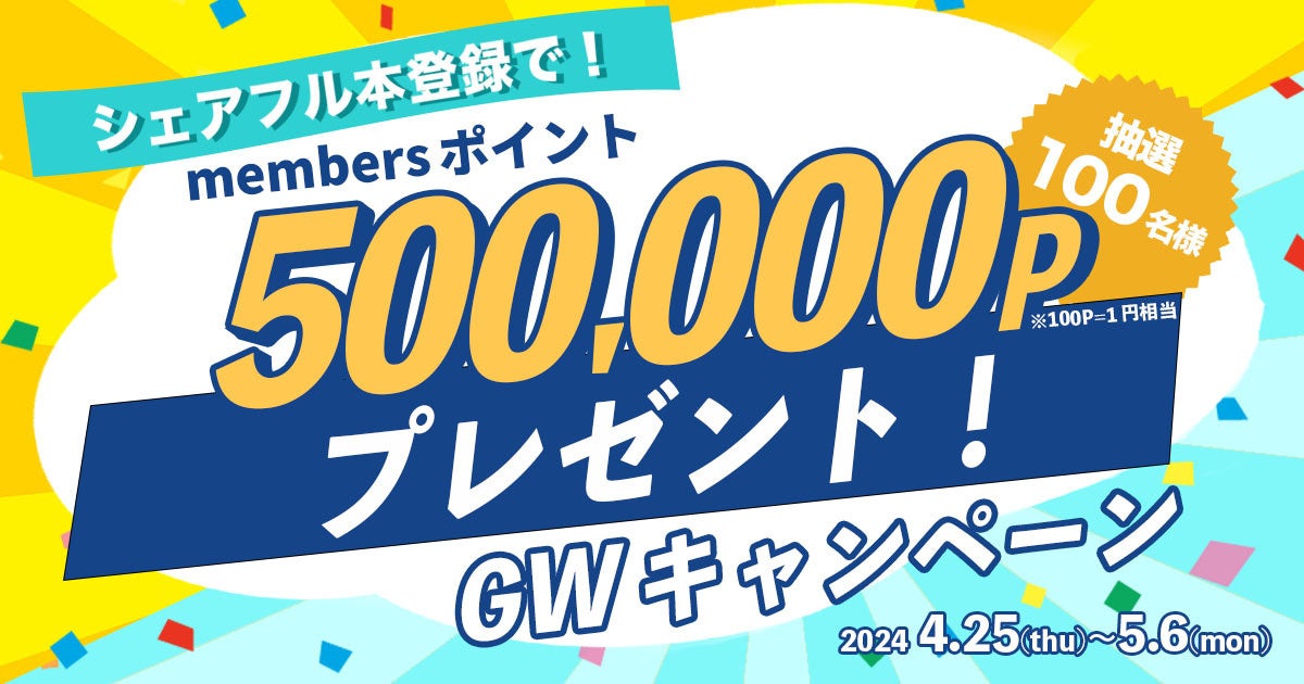 本キャンペーンは、2024年4月25日(木)〜2024年5月6日(月)の期間で、『シェアフル』アプリの本登録(身分証・銀行口座・顔写真などの登録)を行うと抽選で「シェアフルmenbers」のポイントがもらえるキャンペーンです。対象期間中に本登録をした方の中から抽選で100名様に「membersポイント」500,000Pが当たります。貯まったポイントは電子マネーに交換可能です。ぜひ、この機会に『シェアフル』をご利用ください。