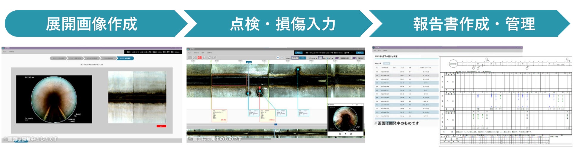 「スマカン」は、広角展開式カメラで撮影した下水道管路内の動画を帯状の画像にする「展開画像の作成」から、熟練技術者による「点検・損傷判定結果の入力」、「調査報告書の出力」までをワンストップで行うことができるソフトウェアです。