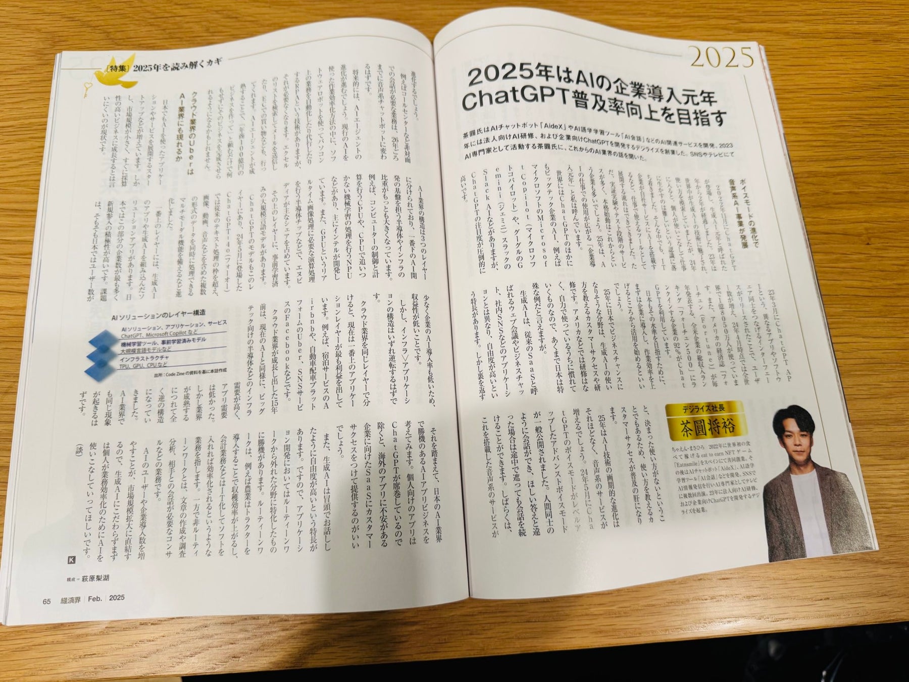 株式会社デジライズ(本社:東京都港区、代表取締役:茶圓将裕)は、経済界2月号にて、2024年のAI業界の総括と2025年の展望について特集記事として掲載されました。見開き2ページにわたる大型特集では、AIソリューションの階層構造から見る市場分析と、企業におけるAI活用の現状について詳細な解説が行われています。
