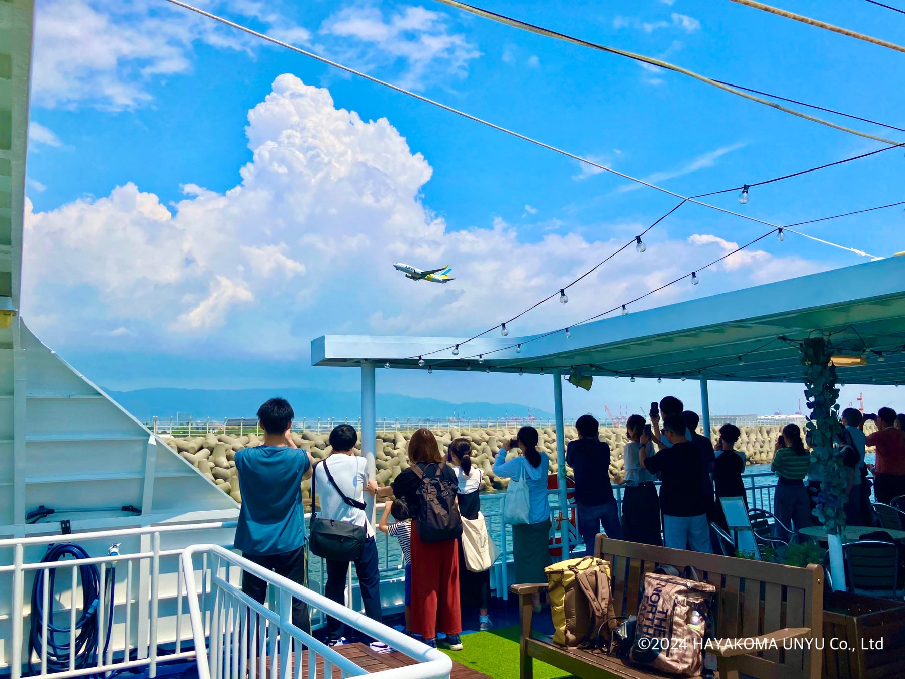 さらに神戸港周辺を周遊する船の中で最も神戸空港の滑走路付近まで接近し、神戸空港に離発着する飛行機を間近でご覧いただけます。景色やお食事を楽しみながらリラックスしてクルージングをお楽しみください!