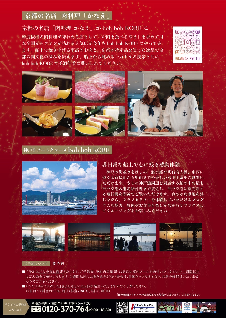 boh boh KOBEで豪華肉料理と花火を堪能する『肉料理 かなえクルーズ~boh boh KOBEでしか味わえないー夜限りの割烹~』をぜひ、お見逃しなく!