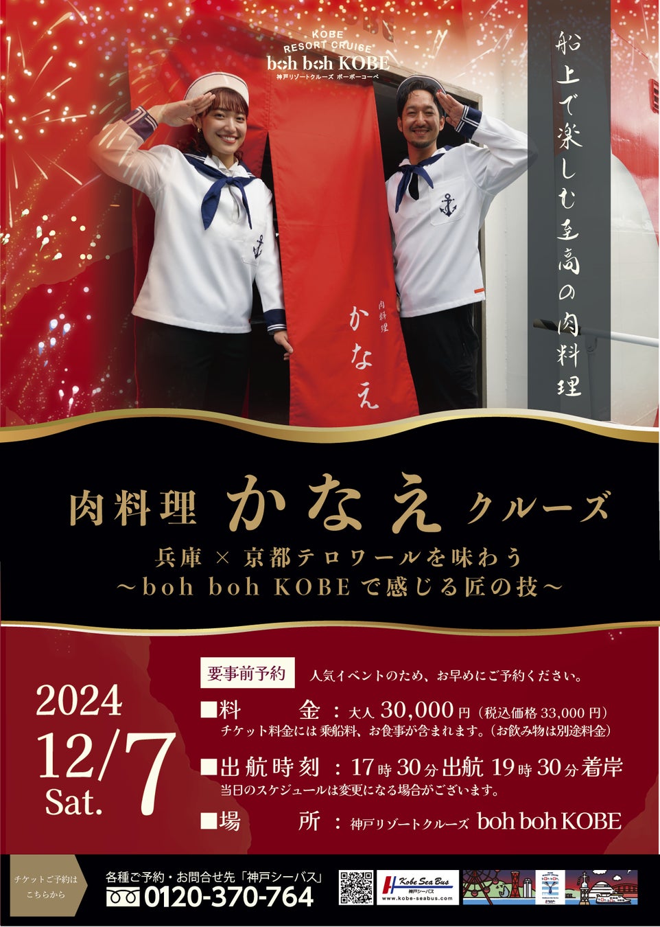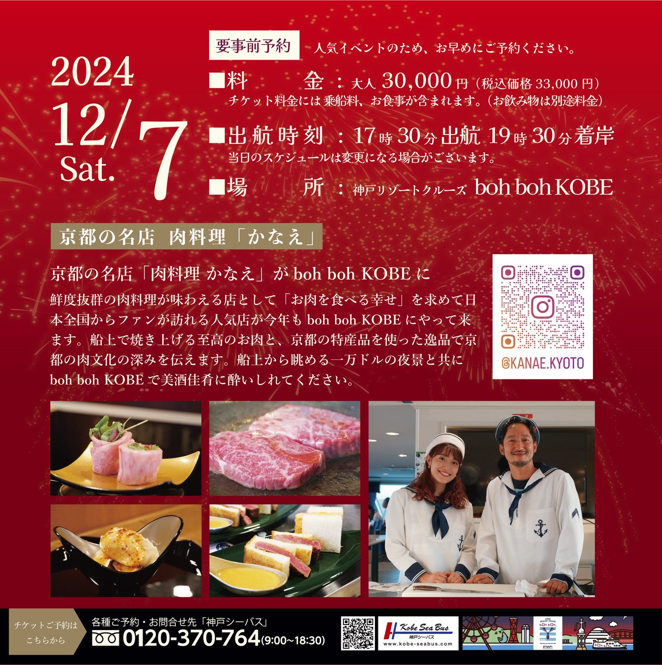 神戸シーバス boh boh KOBEでは12月7日(土)に、兵庫×京都テロワールを味わう一夜限りの特別イベント『肉料理 かなえクルーズ~boh boh KOBEでしか味わえないー夜限りの割烹~』を開催します!