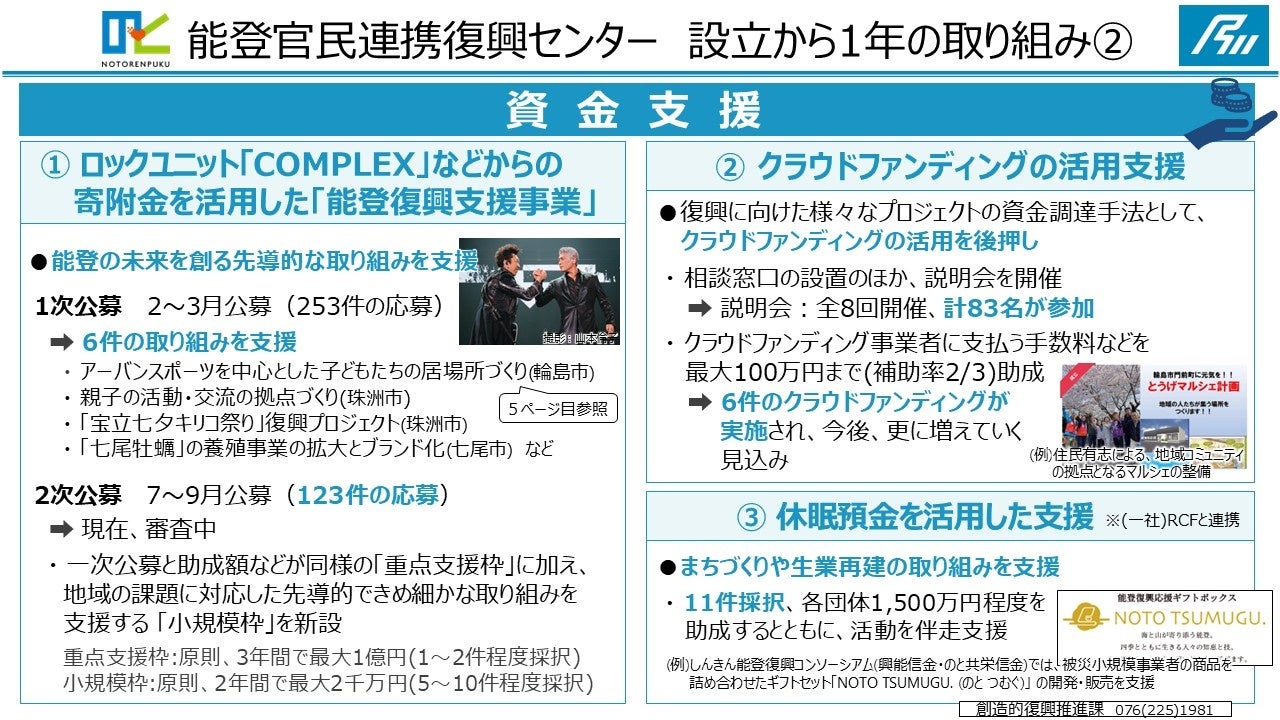 これまで、全国から寄せられる様々な支援の受け皿となり、ロックユニット「COMPLEX」からの寄附金の活用や、LINEヤフーや経済同友会との連携などの取り組みを通じて、復興に取り組む地域団体等に対し、「資金」「人材」「ノウハウ」といった支援を効果的に結びつけてきました。