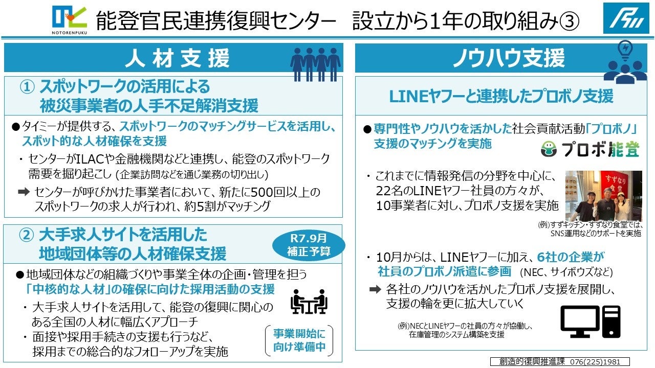 センターがILAC(いしかわ就職・定住総合サポートセンター)や金融機関等と連携し、能登のスポットワーク需要の掘り起こしを行い、センターが呼びかけた事業者において、新たに500回以上のスポットワークの求人が行われ、約5割がマッチングしました。