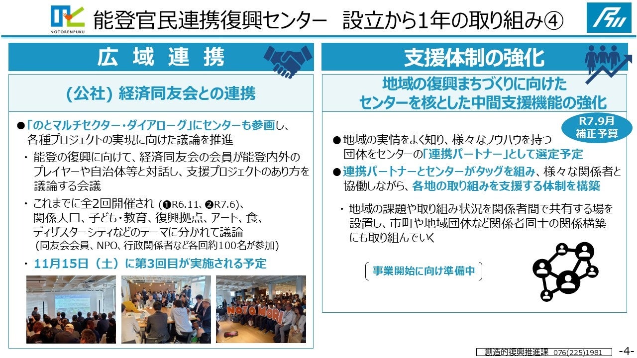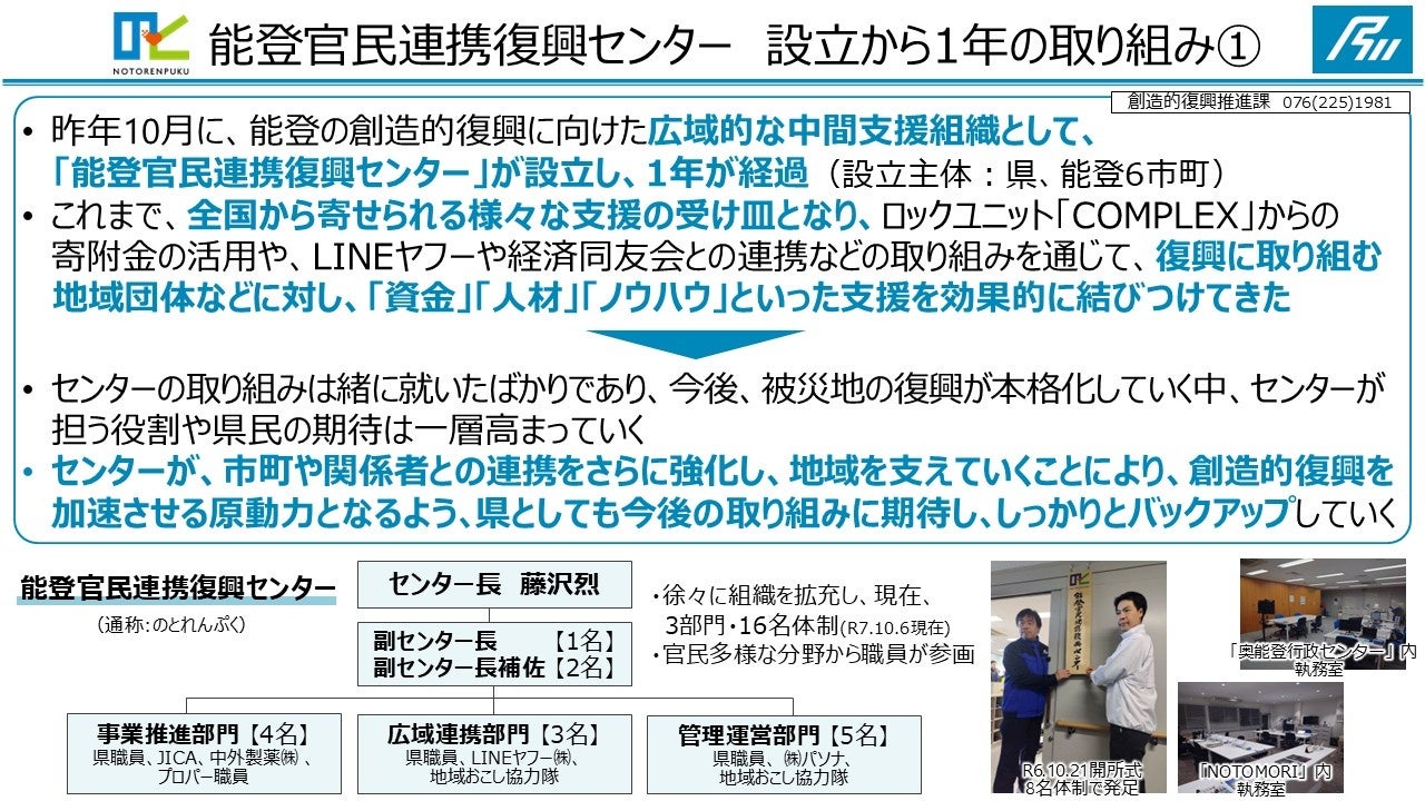 センターが、県内の自治体や関係者との連携をさらに強化し、地域を支えていくことにより、創造的復興を加速させる原動力となるよう、石川県としてもしっかりとサポートしていきたいと考えています。