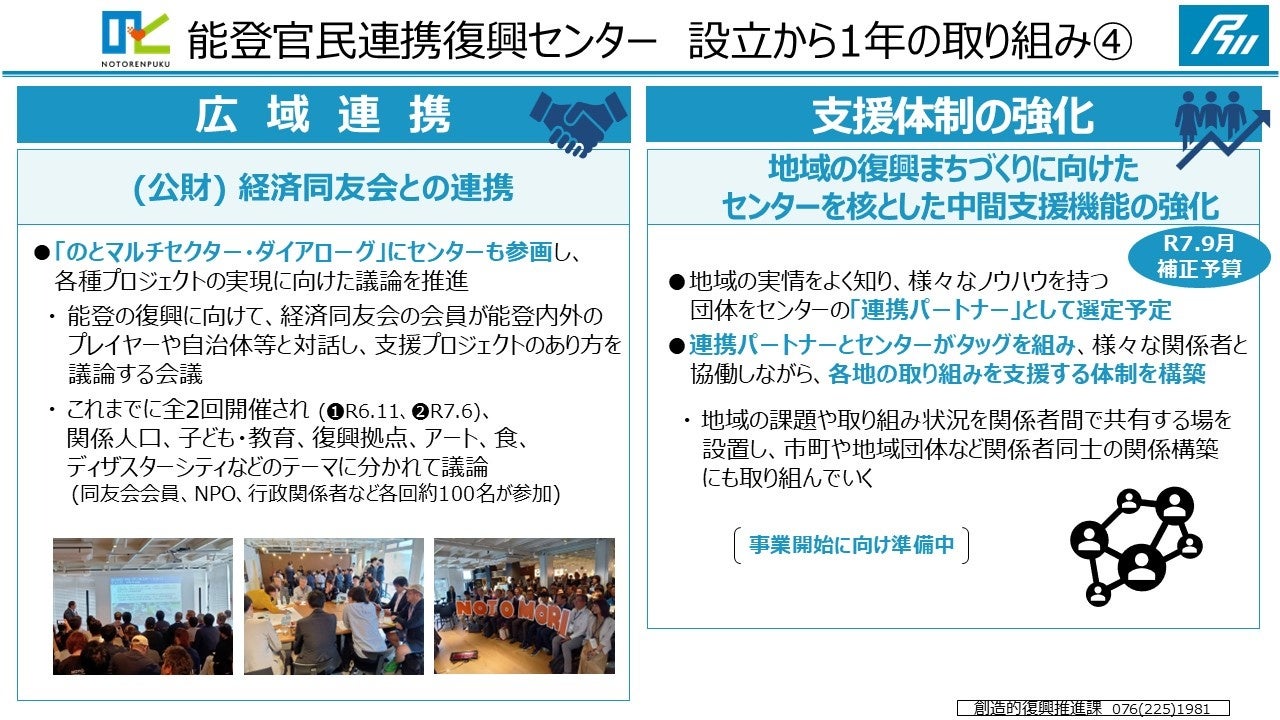 (公財)経済同友会との連携について、能登の復興に向けて経済同友会の会員が能登内外のプレイヤーや自治体等と対話し、支援プロジェクトのあり方を議論する「のとマルチセクター・ダイアローグ」にセンターも参画し、各種プロジェクトの実現に向けた議論を推進しています。