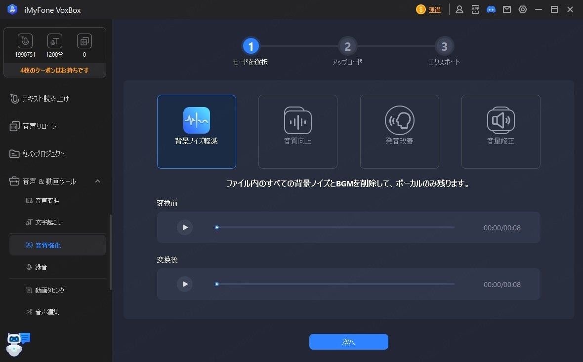 音質向上:音声ファイルの明瞭さなど全体的な音質を改善し、スタジオ品質の声を生成します。