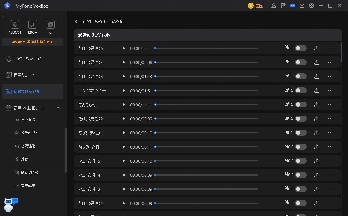 「私のプロジェクト」:すべてのテキスト読み上げ履歴を保存します。