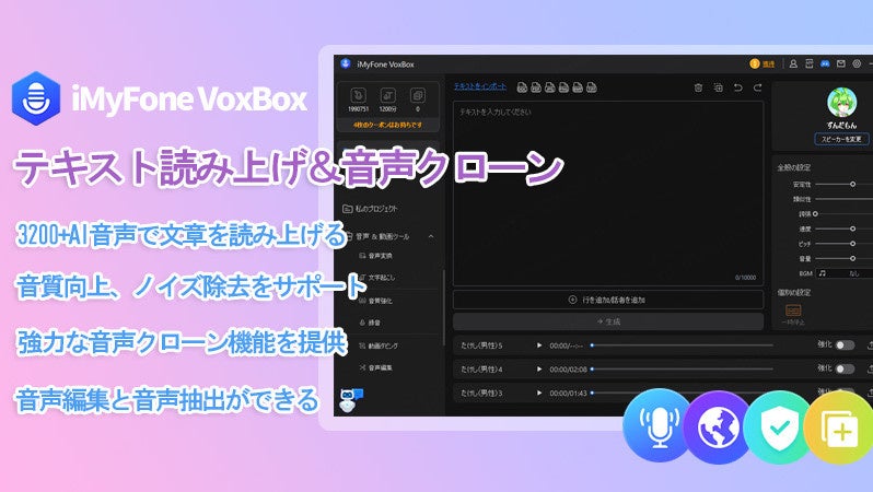 世界中で200+の権威メディアが推奨されたソフトウェア開発会社iMyFoneは9月27日(金)より、強力なテキスト読み上げ&音声クローンソフト「VoxBox」V5.9.4を発表しました!読み上げに利用できるAI音声が増え、音声ノイズ低減サービスが提供され、操作インターフェースが最適化されています。