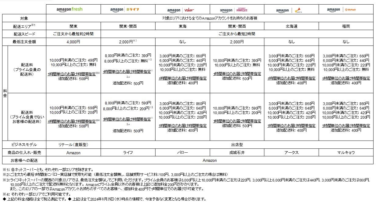Amazonは、Amazon上のマルキョウネットスーパーに加えて、東京・神奈川・千葉・埼玉の一部エリアにおいて「Amazonフレッシュ」(www.amazon.co.jp/fresh)を、食品スーパーライフとの協業により、東京・神奈川・埼玉・千葉・大阪・京都・兵庫の一部エリアにおいてライフネットスーパー(www.amazon.co.jp/life)を、スーパーマーケットバローとの協業により、愛知の一部エリアにおいてバローネットスーパー(www.amazon.co.jp/valor)を、スーパーマーケット成城石井との協業により、東京・神奈川・愛知の一部エリアにおいて成城石井ネットスーパー(www.amazon.co.jp/seijoishii)を、アークスとの協業により、北海道の一部エリアにおいてアークスネットスーパー(www.amazon.co.jp/arcs)を、Amazon上でそれぞれ展開しています。対象エリアのAmazon.co.jpアカウントをお持ちの全てのお客様は、追加の登録手続きや会費無しでAmazon.co.jp(Webサイト、Amazonショッピングアプリ)上で各ネットスーパーをご利用いただけます。今後も日々の生活に欠かせない食料品や日用品をお得な価格でご提供するとともに、配送エリアの順次拡大を続けてまいります。