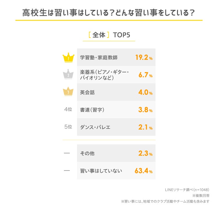 高校生は、学校の部活とは別でどのような習い事をしているのでしょうか。地域でのクラブ活動やチーム活動を含め、している習い事について聞きました。