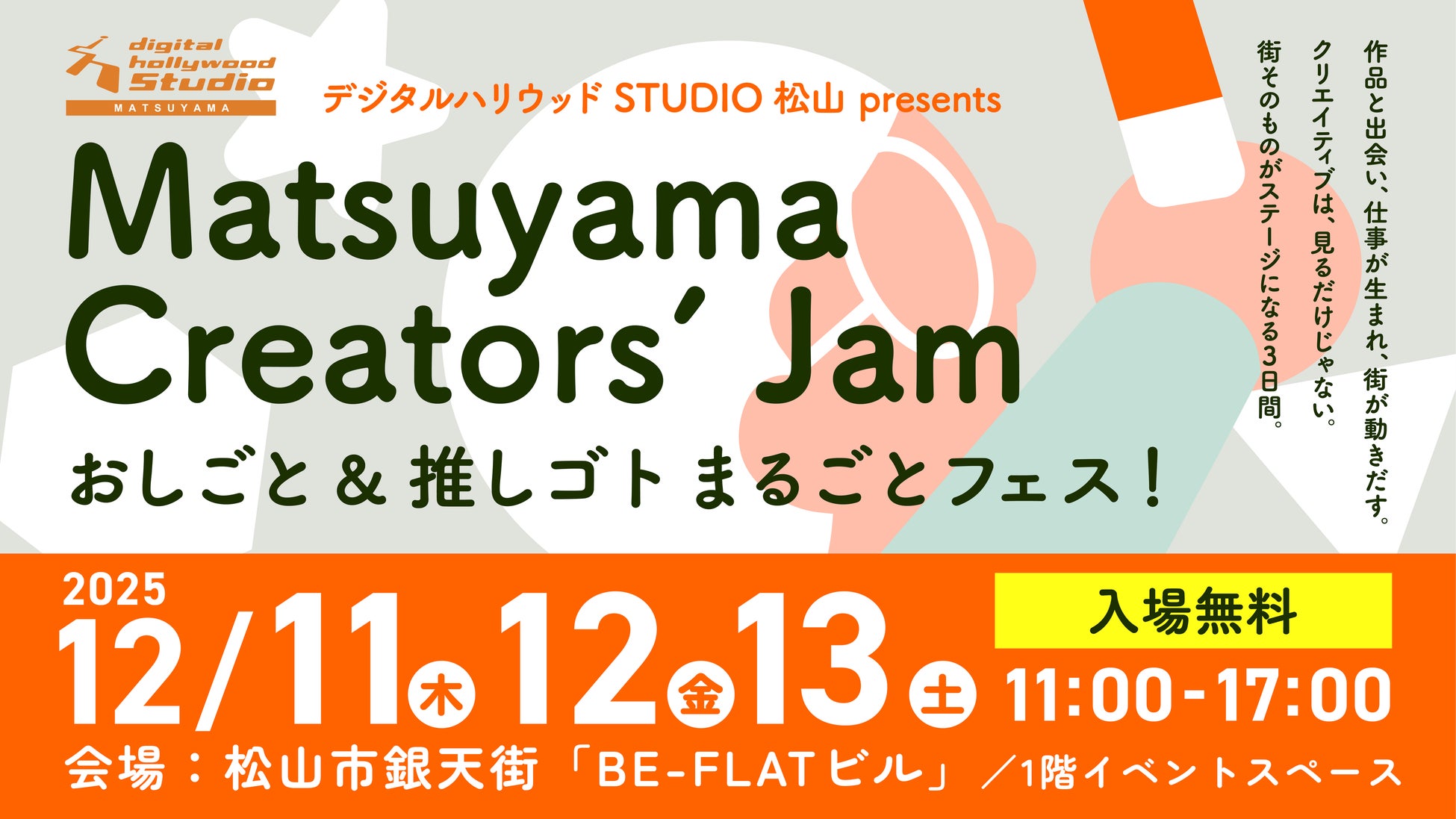 デジタルハリウッドSTUDIO松山(所在地:愛媛県松山市)は、2025年12月11日(木)〜13日(土)の3日間、銀天街「BE-FLATビル」1階イベントスペースにて、在校生・卒業生・企業・地域住民が一堂に会するクリエイティブイベント「Matsuyama Creators’ Jam おしごと & 推しゴト まるごとフェス!」を開催します。