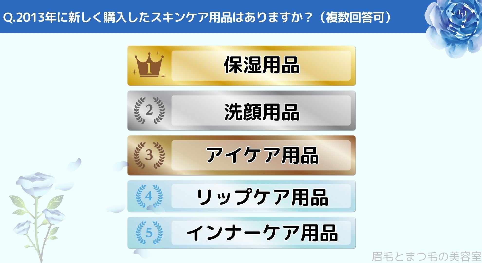 2013年に新しく購入したスキンケア用品をお聞きしたところ「1位>保湿用品」、「2位>洗顔用品」、「3位>アイケア用品」、「4位>リップケア用品」、「5位>インナーケア用品」という結果になりました。