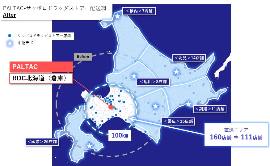 道内192店舗のうち約80%(160店舗)は、PALTACの拠点(RDC北海道)から直送していましたが、佐川急便の拠点などをデポとして活用することで移動距離を短縮しました。