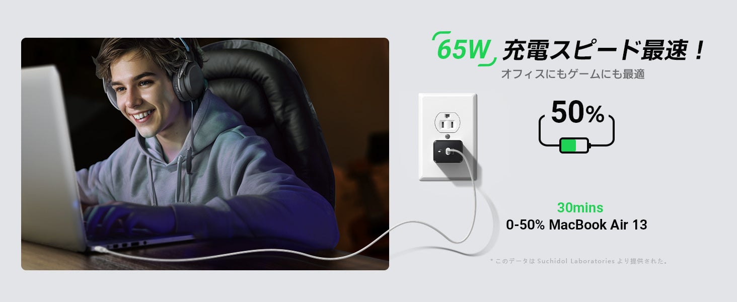 「S-mini」は、最大65Wの出力で、従来のUSB-C充電器の6倍の速度で充電可能。MacBook Airは約2時間、MacBook Proは約1.5時間でフル充電。iPhone 15なら30分で0~60%まで急速充電できます。フル充電までの時間を大幅に短縮し、日々の充電ストレスを解消します。