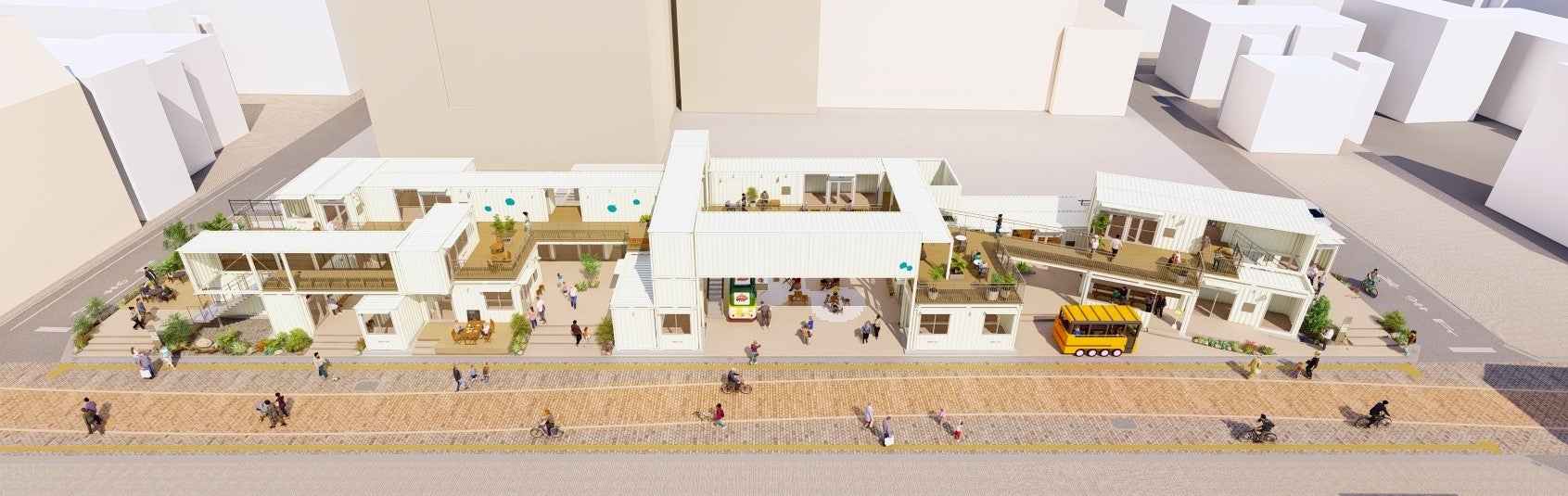 建築用コンテナの外観が特徴的な本施設は、地域の皆様に親しまれている店舗から県内外問わず人気を集める店舗まで幅広い店舗が集積し、広島通りの新たな顔となることをめざします。来店者のみなさまには、地域の素材を活かした食物販店や飲食店、こだわりの品を提供する物販店など、“個性あふれるローカルマーケット”を巡って楽しんでいただけます。また、共用テラスやイベント広場、デッキスペースは、コミュニケーションや賑わい創出の場として街のさらなる活性化に寄与します。