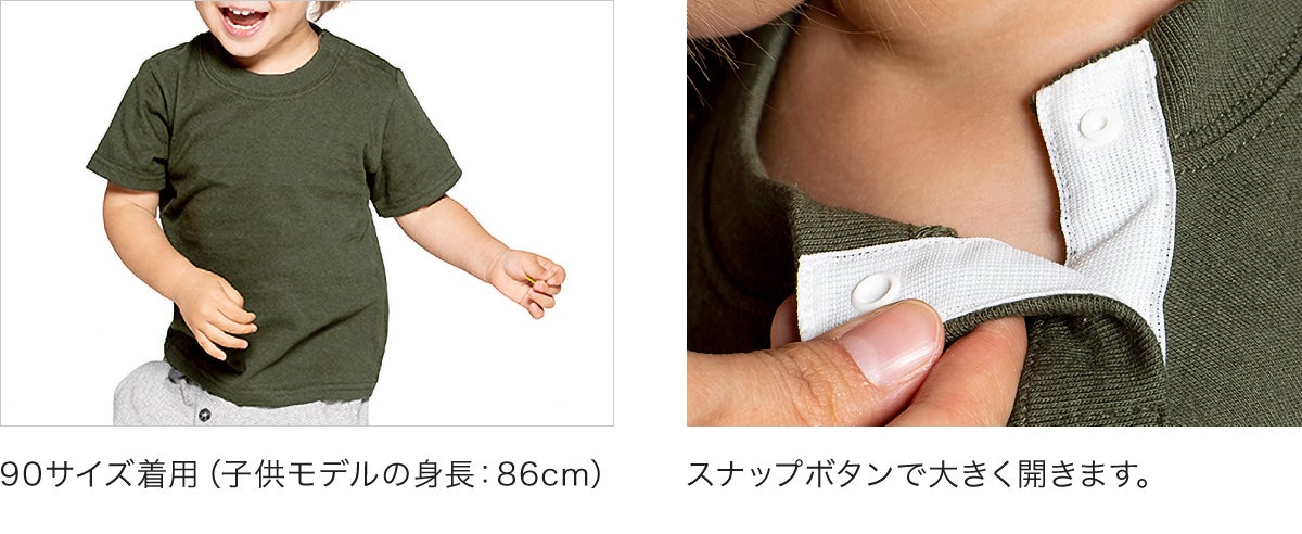 お肌に優しい綿100%の素材を使用しておりますので、お子様も安心してご着用いただけます。襟元はボタン一体型のスナップテープで大きく開くため、着脱もしやすい仕様です。