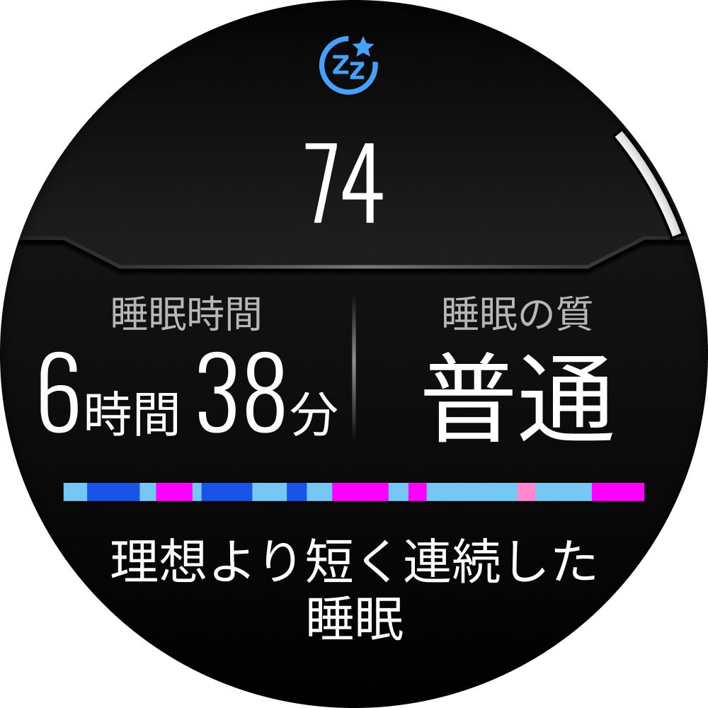 Garminの睡眠機能は単なる睡眠のパターン(浅い・深い・レム睡眠・覚醒)の計測だけでなく、その詳細を分析し、一人ひとりに合わせた提案までを提供します。