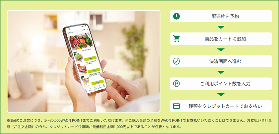 利用上限 保有ポイント数に応じて1回のご注文につき1~30,000WAON POINTまでご利用可能