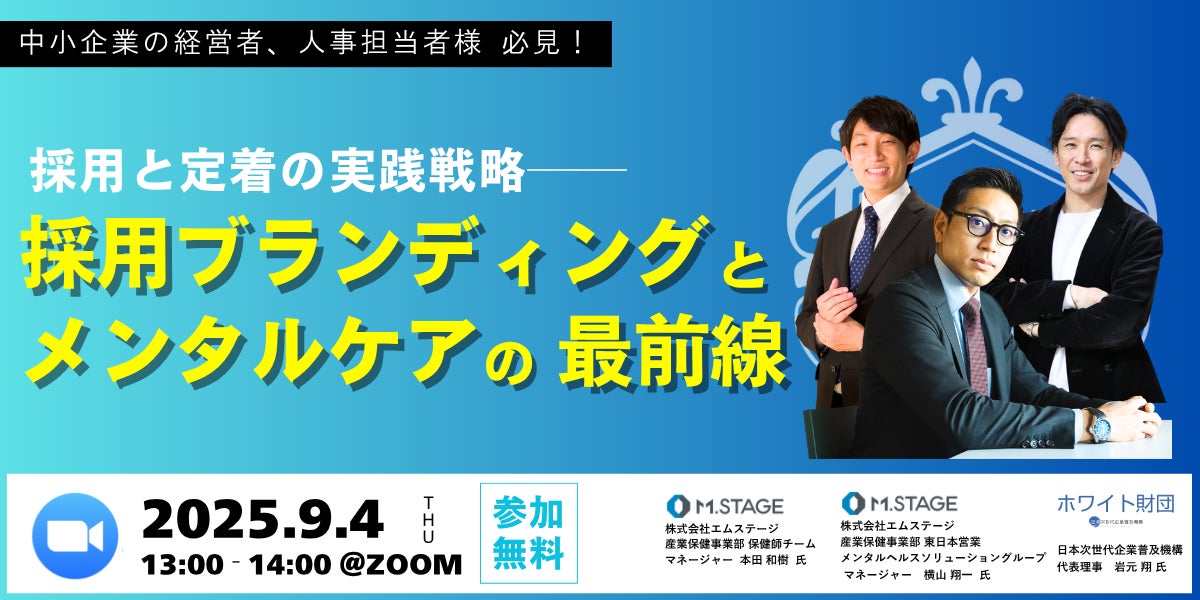 株式会社エムステージ(本社:東京都品川区、代表取締役:杉田雄二)産業保健事業部は、9/4(木)13時より、一般財団法人日本次世代企業普及機構(通称:ホワイト財団)と、採用と定着の両面から実践的なアプローチを解説するウェビナーを開催いたします。
