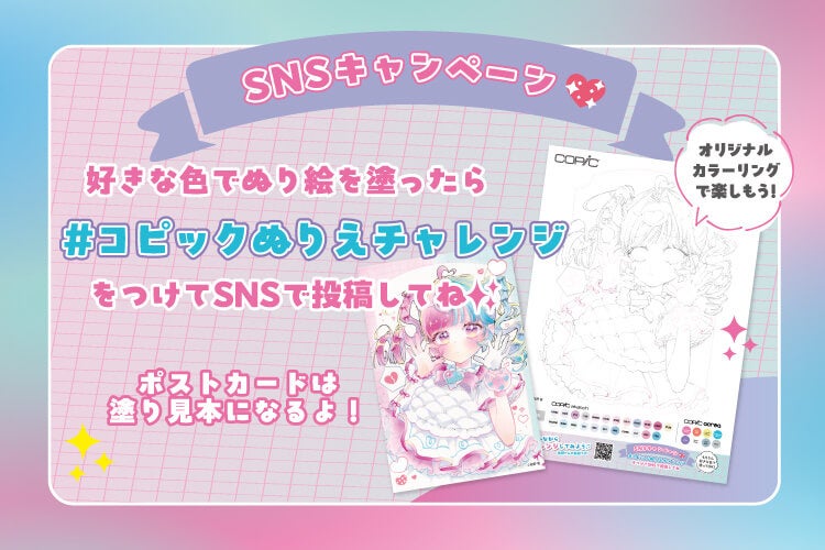 2025年1月31日から3月末まで、対象店舗でコピックの特製ポストカードとぬりえが無料でもらえるキャンペーンを開催します。