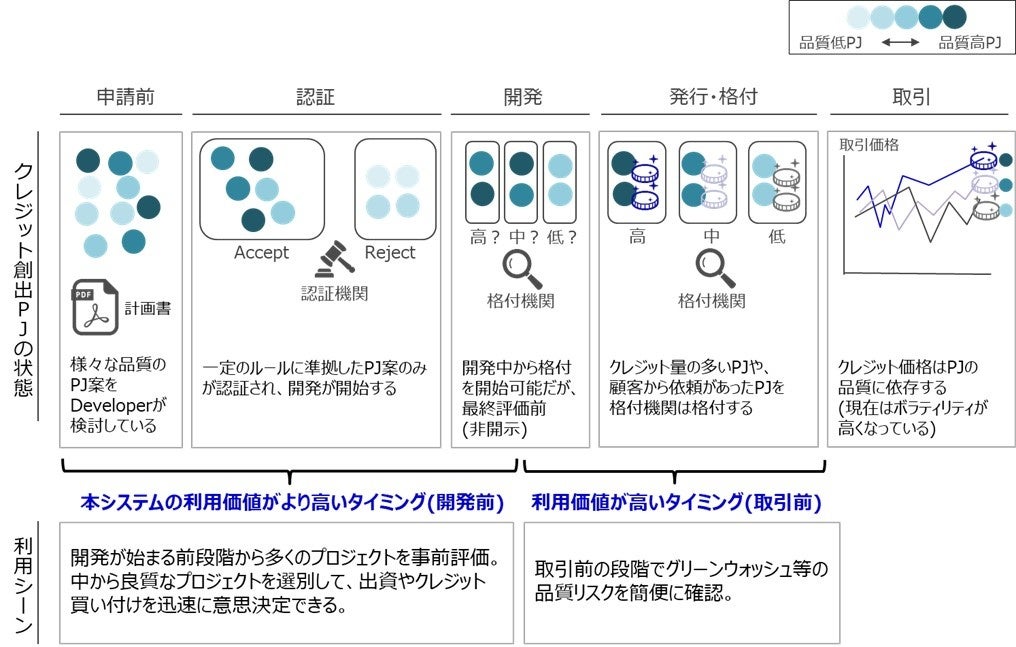・クレジットの取引前の段階で本システムによりクレジットの品質を評価することで、グリーンウォッシュなどの品質リスクを簡便に確認できる