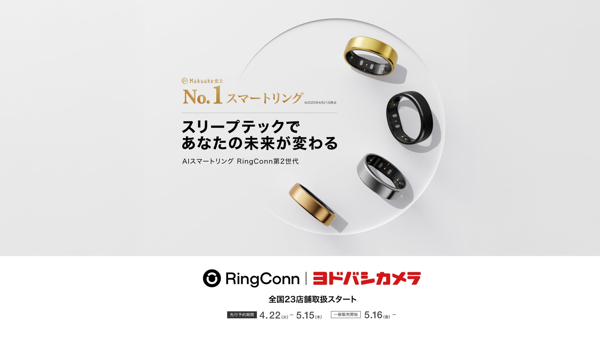 Makuake歴代1位*『RingConn(リンコン) 第2世代』が、ヨドバシカメラ全国23店舗にて、2025年4月22日(火)から先行予約販売 / 5月16日(金)から一般販売スタート
