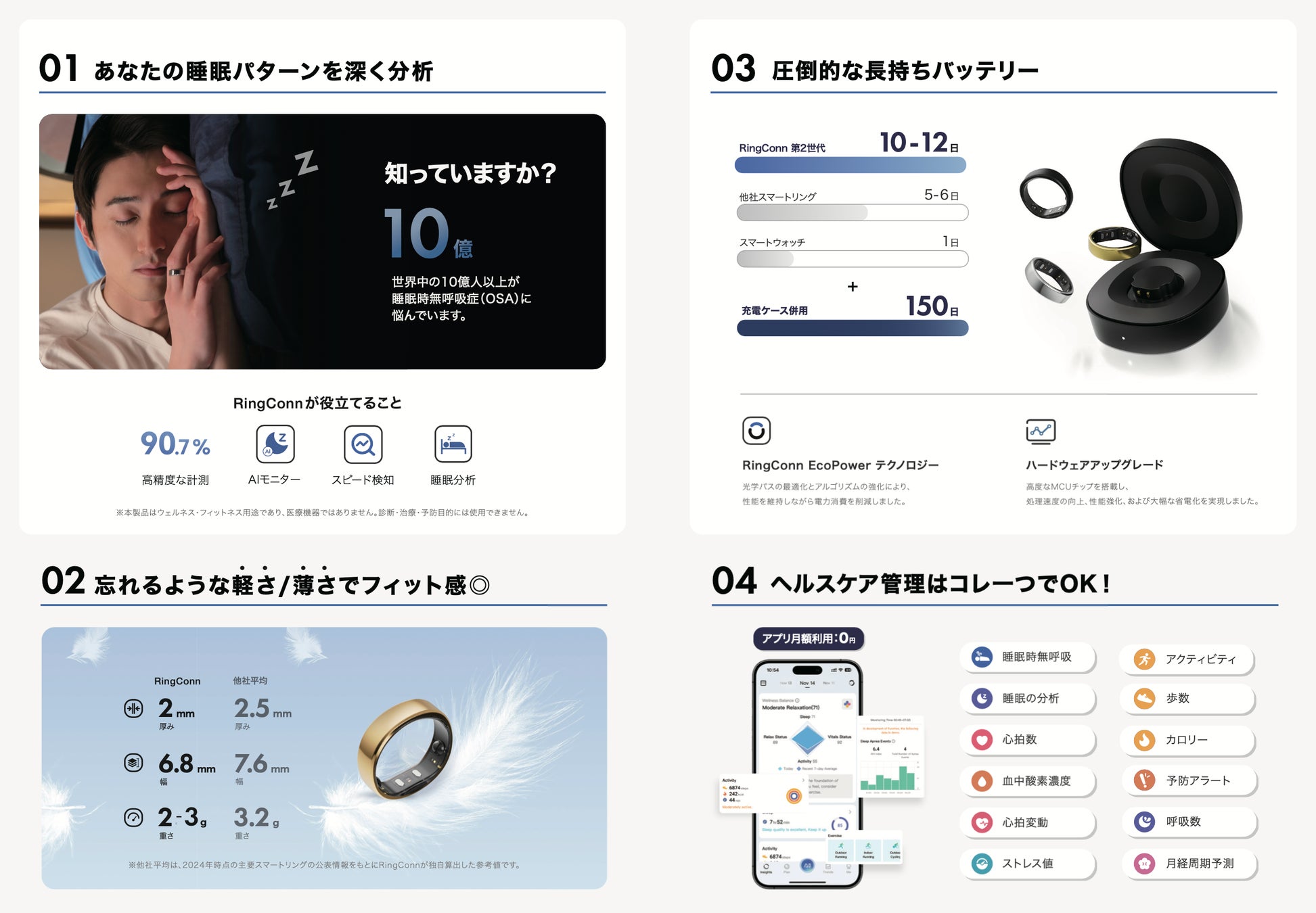 その他、スマートリングとしての機能が充実しています[搭載機能: 睡眠時呼吸計測・睡眠分析・心拍数・血中酸素濃度・ストレス値測定・アクティビティ・カロリー計算・健康アラート・月経周期予測機能]。iPhoneやAndroidから専用アプリが使用可能です。