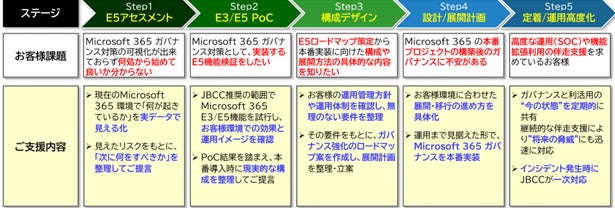 本サービスでは、Microsoft 365 の導入にあたり、検証段階からJBCCのSEがアセスメントを行うことで、脆弱性の対応ポイントを可視化し、ユーザーが安心安全に Microsoft 365 を利用できる環境を構築します。対応すべき個所を明らかにしたあとは、お客様環境での効果と運用イメージを確認するPoC(概念実証)支援を行い、運用開始後も監視や改善提案を通じて継続的にサポートするため、運用のノウハウがないお客様でも、ガバナンスの強化と、運用負荷軽減が可能です。