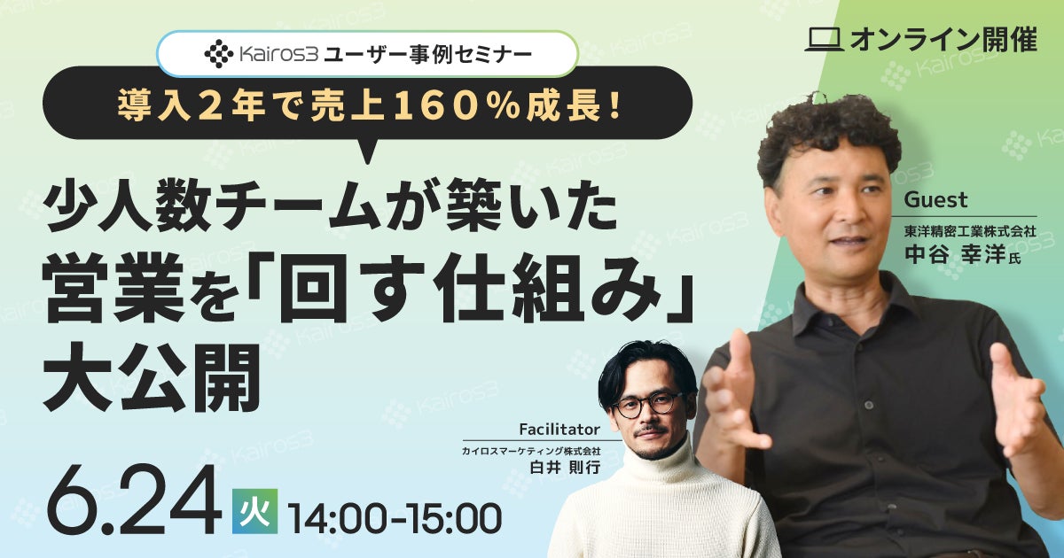 “次の一手”がデータでわかるMA+SFA一体型ツール「Kairos3(カイロススリー)」を提供するカイロスマーケティング株式会社(本社:東京都渋谷区、代表取締役:佐宗 大介、以下「当社」)は、オンラインセミナー「導入2年で売上160%成長!少人数チームが築いた、営業を『回す仕組み』大公開」を6月24日(火)に開催いたします。