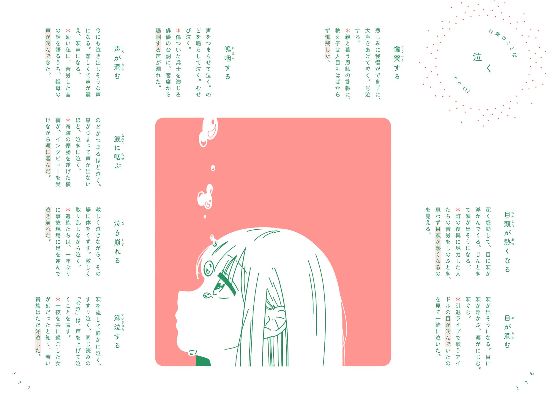 第一部では「感情のことば」を中心に、基本となる感情のテーマごとに気持ちを表すことばを紹介しています。第二部では「行動のことば」「体のことば」を中心に、行動に表れる気持ちや体の部位で気持ちを表す慣用句などを紹介しています。
