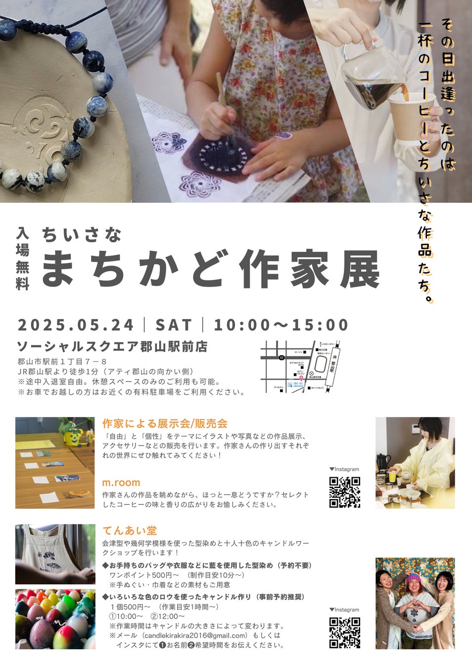 ソーシャルスクエア郡山駅前店にて、2025年5月24日(土)に、地域の方とコラボしたごちゃまぜイベント「ちいさなまちかど作家展」を開催します。