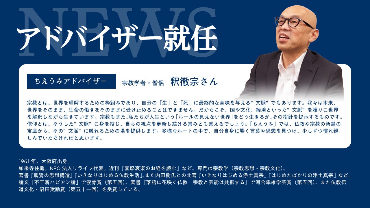 株式会社佼成出版社(本社:東京都杉並区、代表取締役:中沢純一)が運営する「ちえうみ」事業のアドバイザーに、宗教学者で僧侶の釈徹宗氏が2025年2月1日より就任されました。