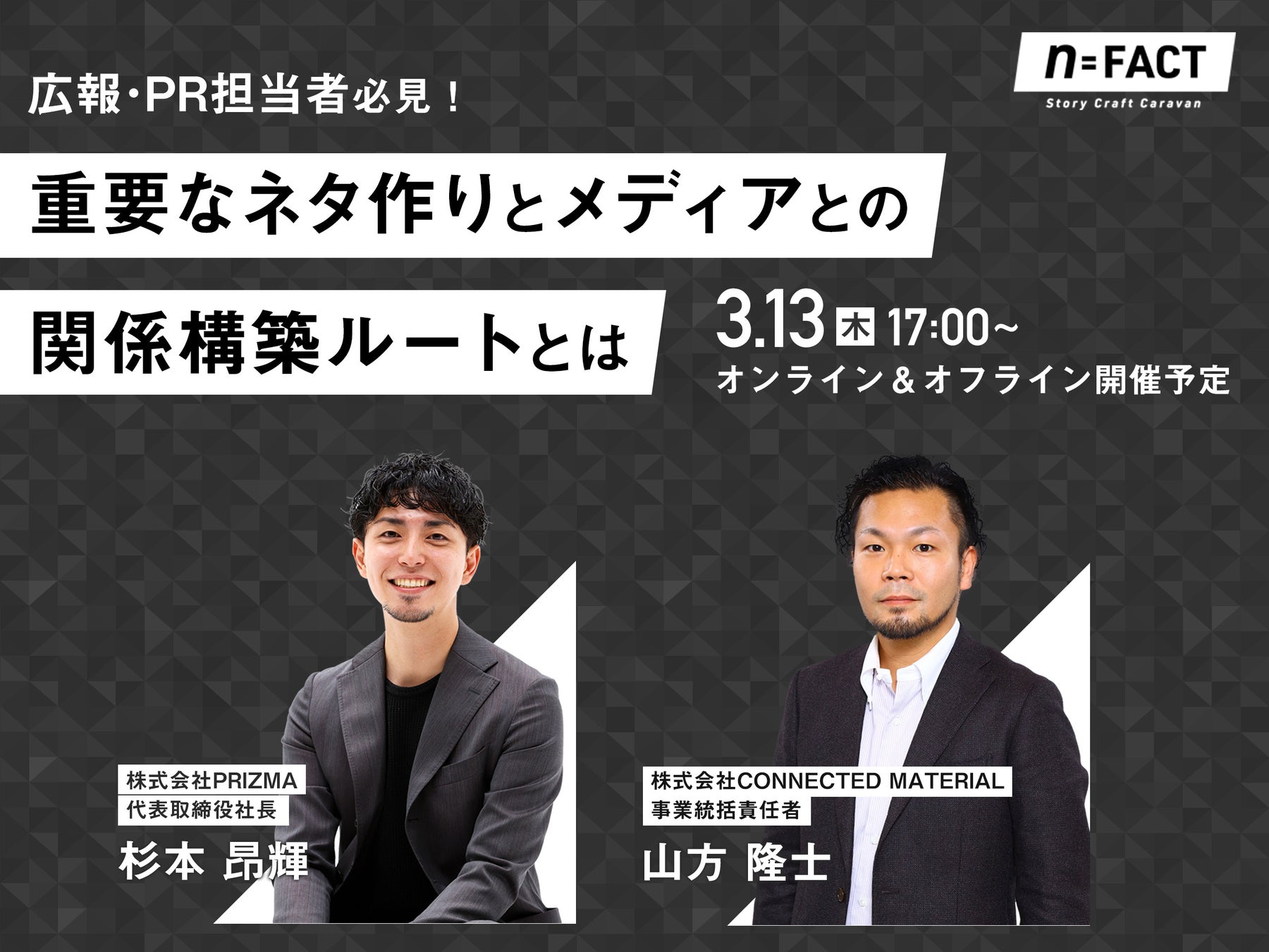 企業のPR支援プロダクト「PRIZMA」ブランドを展開する株式会社PRIZMA(https://www.prizma-link.com/)は、企業とメディアをつなぐ広報・PR支援サービス「CLOUD PRESS ROOM」を運営する株式会社CONNECTED MATERIAL(本社:東京都港区、代表取締役社長:河野 貴浩)と共催で、2025年3月13日(木)17:00-18:30に『広報・PR活動で重要なネタ作りとメディアとの関係構築ルートとは』と題するセミナーを開催いたします。