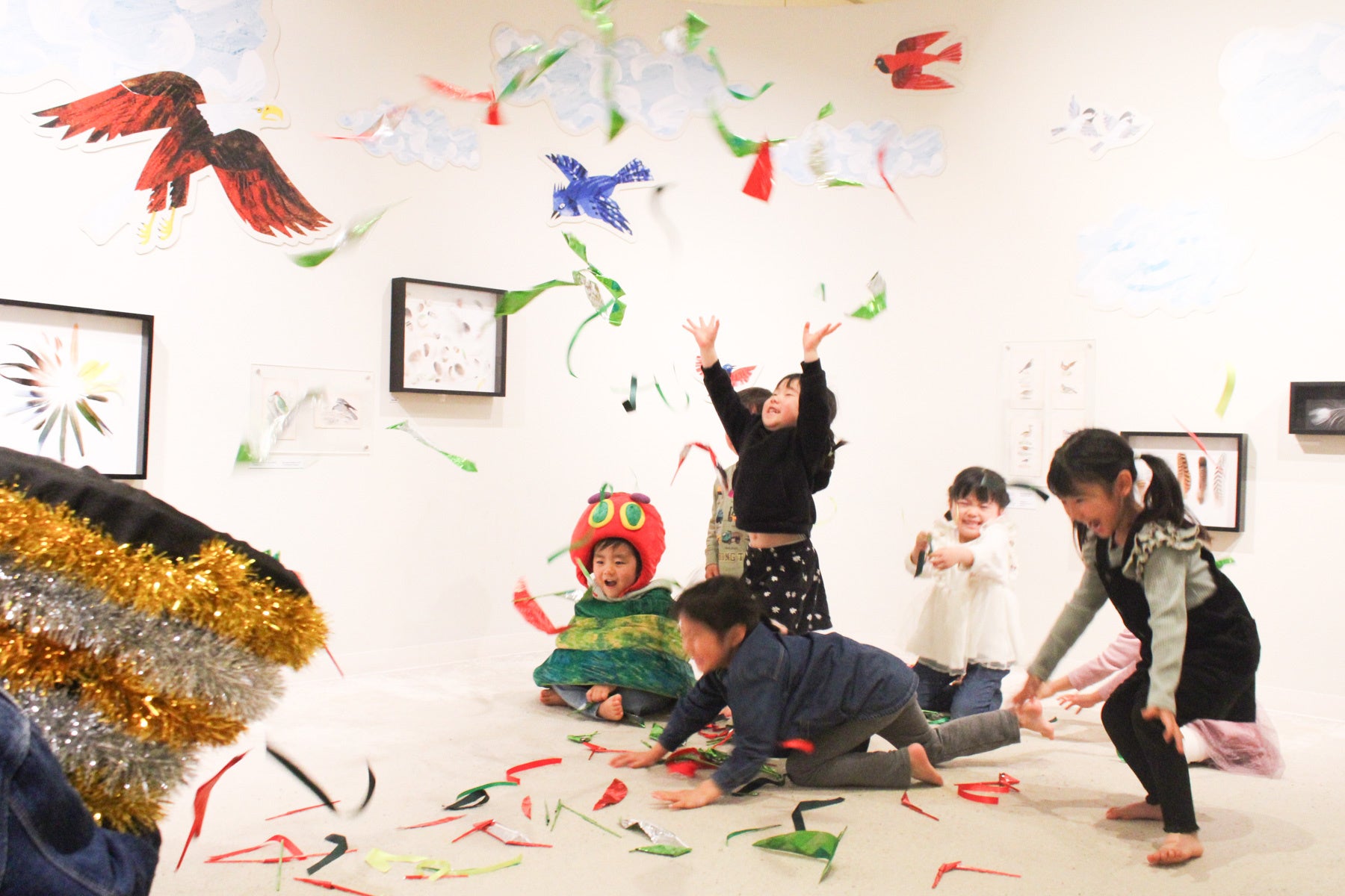 見たこともないくらい巨大なクラッカーで、「はらぺこあおむしの日」をお祝いします。次々に飛び出すあおむしカラーのキラキラのリボンをキャッチしたり、埋もれてみたりと、パーティ気分を楽しみます。