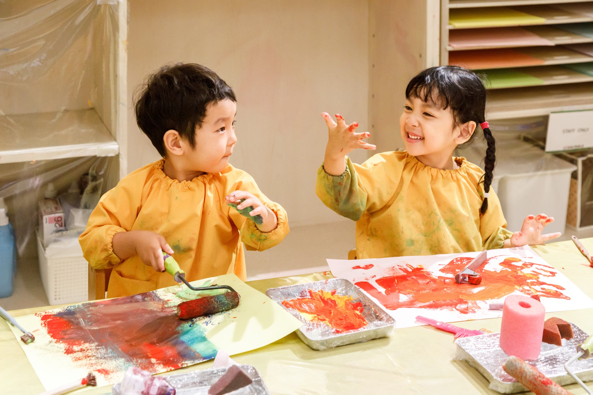 エリック・カールのイラストの一部に、手形や足形を押す人気のワークショップ。はらぺこあおむしが大好きな「葉っぱ」のイラストで開催します。通常は0~2歳を対象にしていますが、特別に年齢関係なくご参加いただけます。