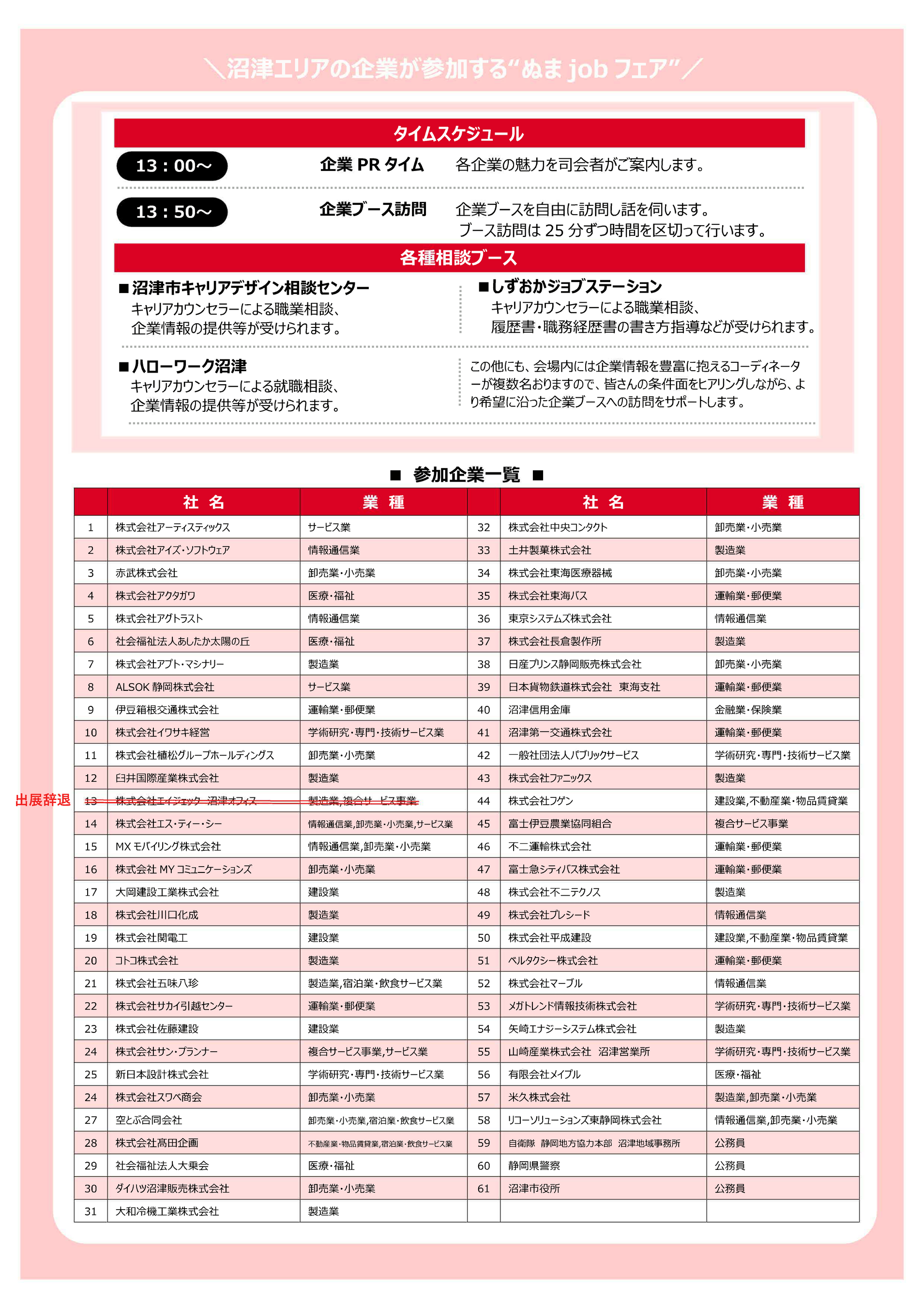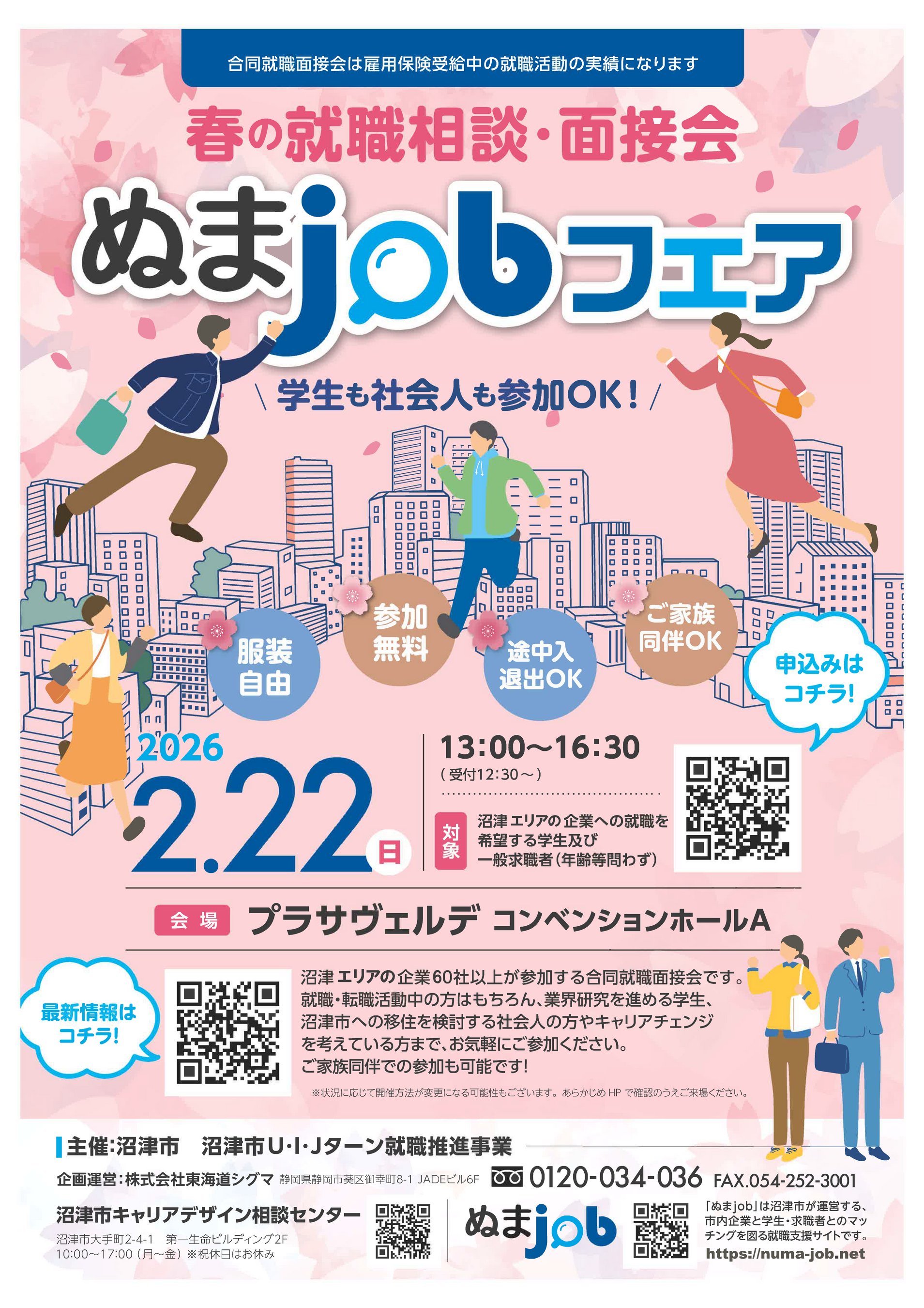 沼津エリアの企業60社が参加する合同就職面接会「ぬまjobフェア」を開催します。