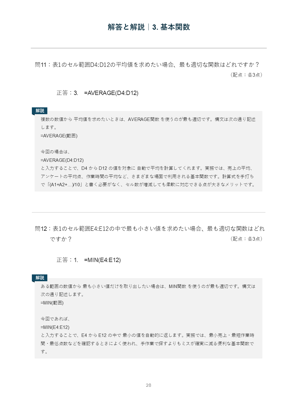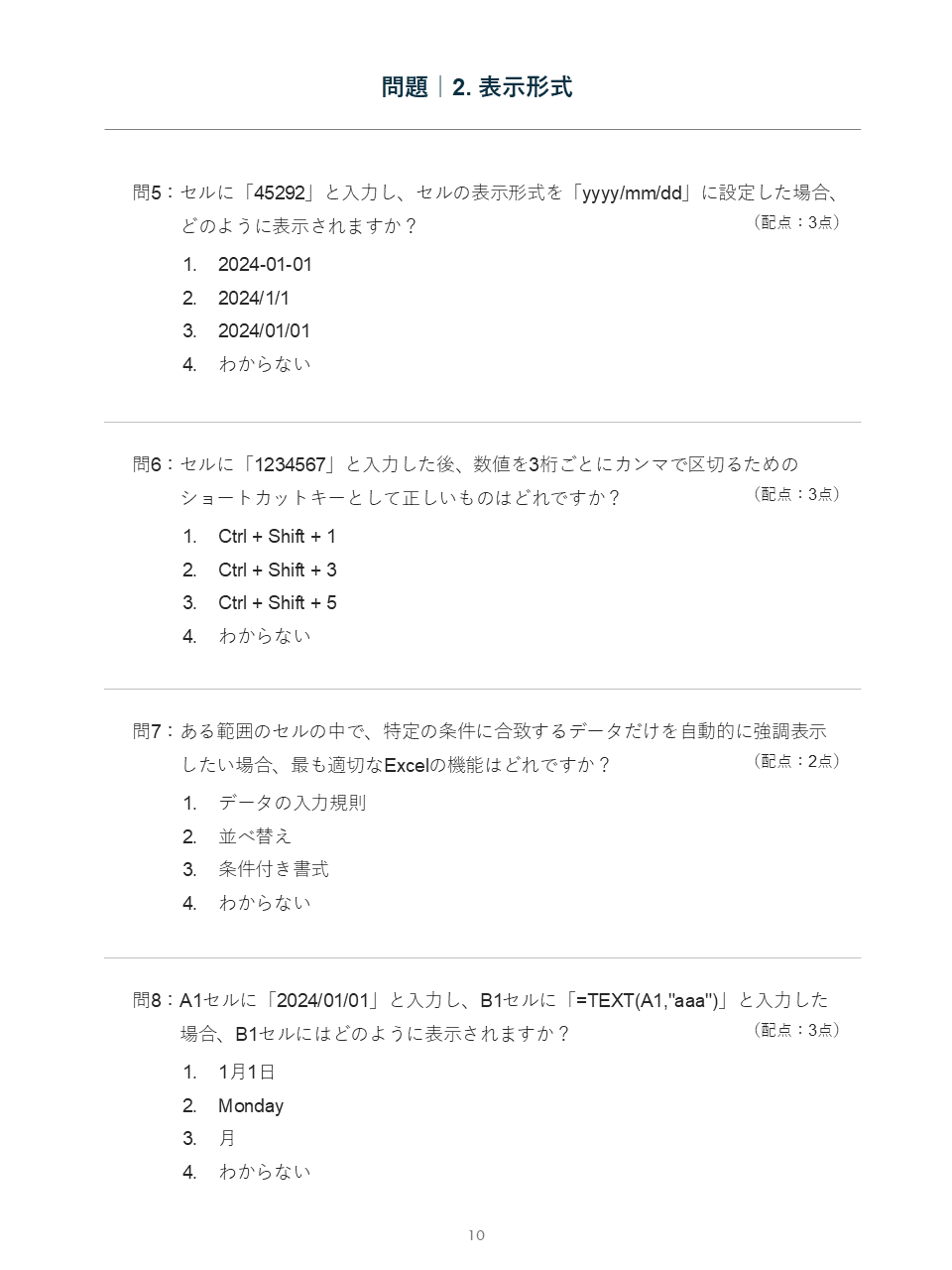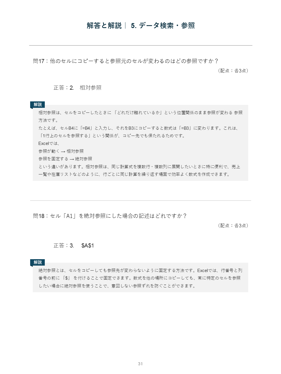 実務で頻出する、①四則演算②表示形式③基本関数④データ集計・分析⑤データ検索・参照⑥文字列操作⑦エラー処理⑧データ整形の8領域を網羅。現場のボトルネックとなりやすいポイントを重点的にチェックできる問題設計となっています。