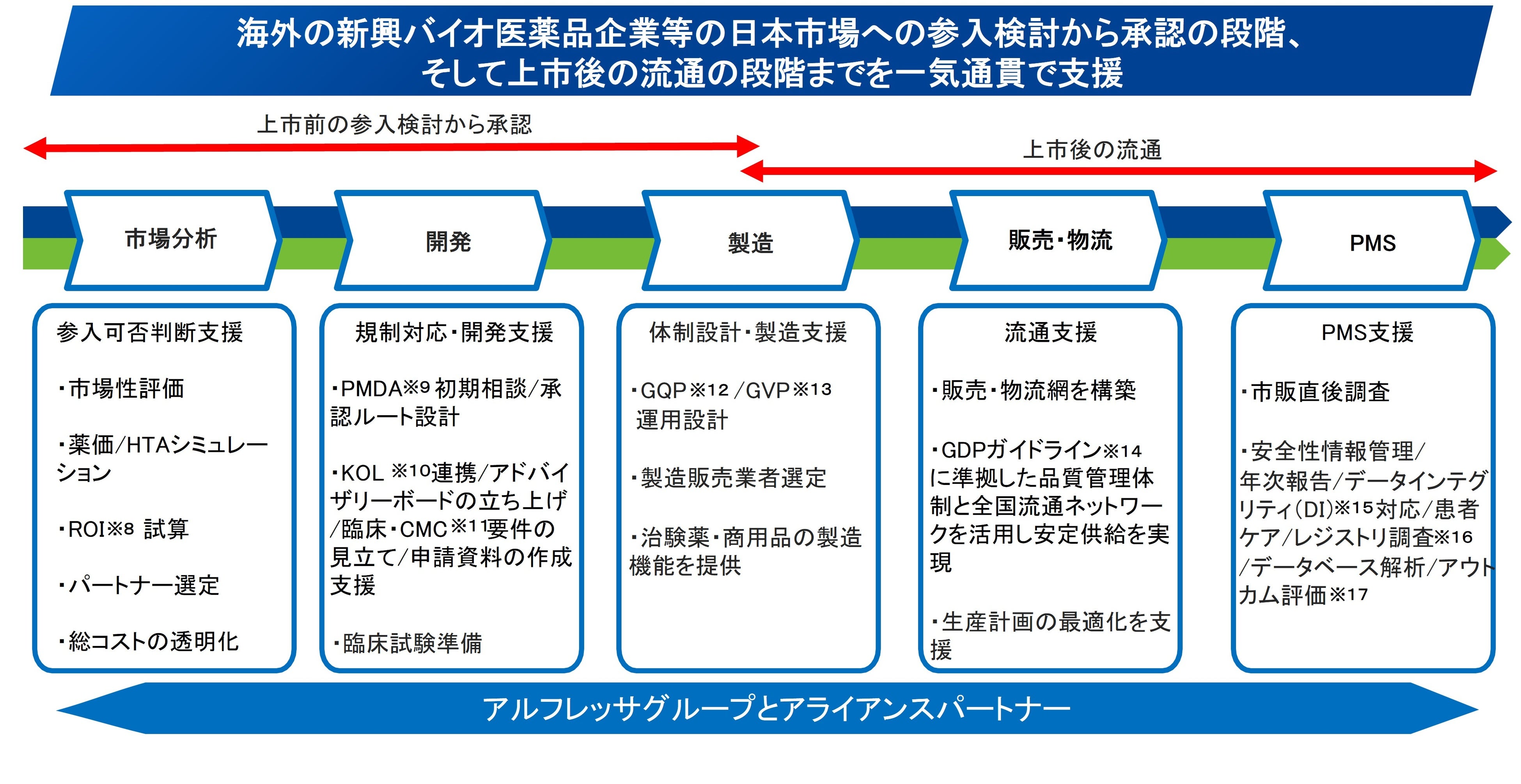 「PATH-Solution」は、海外の新興バイオ医薬品企業等の様々なニーズに合わせたサービス単位の自由な組み合わせが可能であり、柔軟性の高い参入支援サービスです。30年以上のCRO※7実績を持つArkMS株式会社、2009年より本格的に受託製造事業を展開しているアルフレッサ ファーマ株式会社、再生医療分野においてグローバル基準の品質と再現性を備えた製造体制の構築を進めているセルリソーシズ株式会社、国内における医療用医薬品卸売上高No.1の流通ネットワークを持つ医療用医薬品等卸売事業などのグループ企業や事業に加え、アライアンスパートナーとの協業により、最適な支援体制を構築し、さらに強化していきます。
