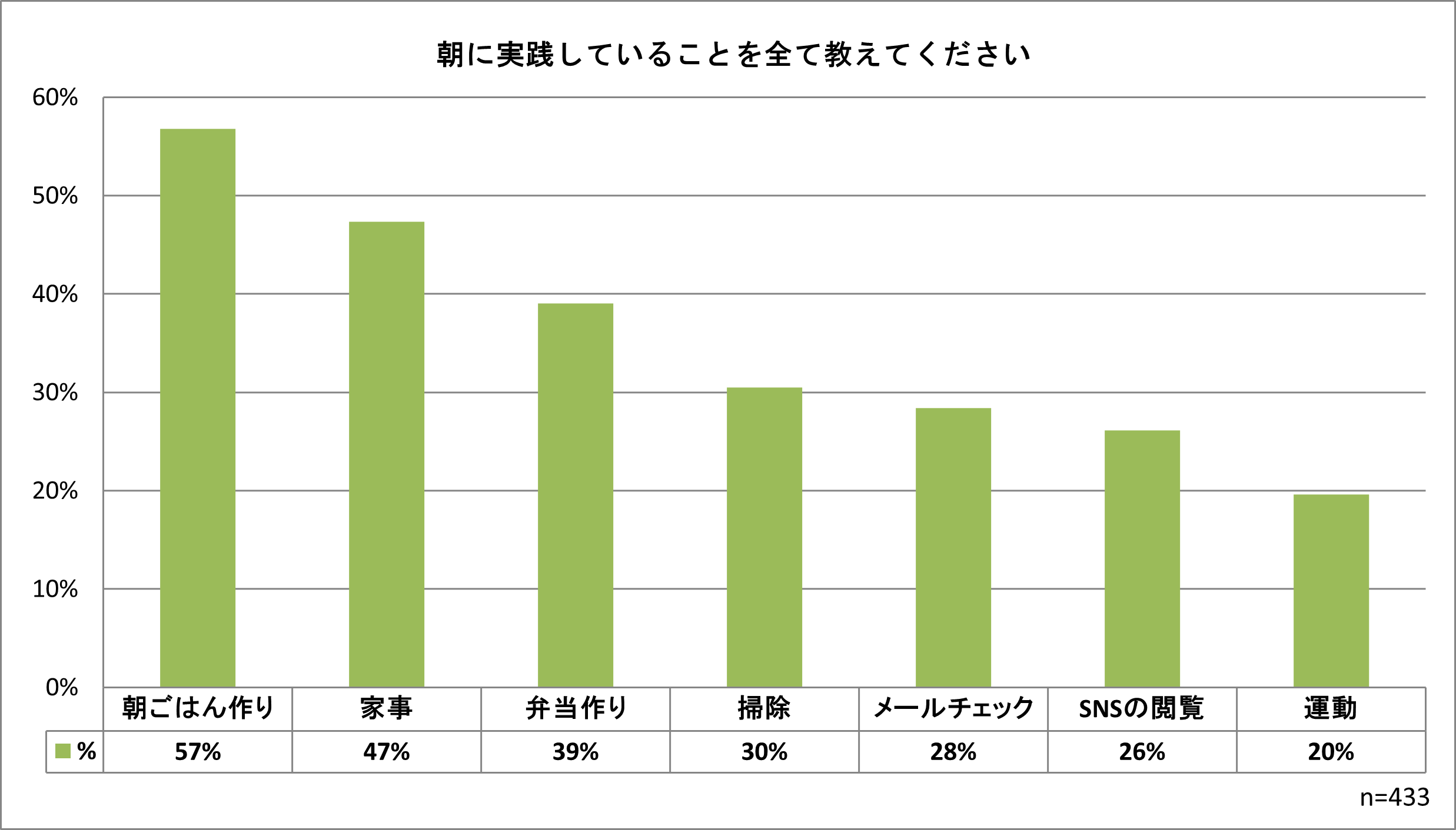 - 朝に実践していること、朝ごはん作り、家事、弁当作りが上位。運動も20%まで伸長