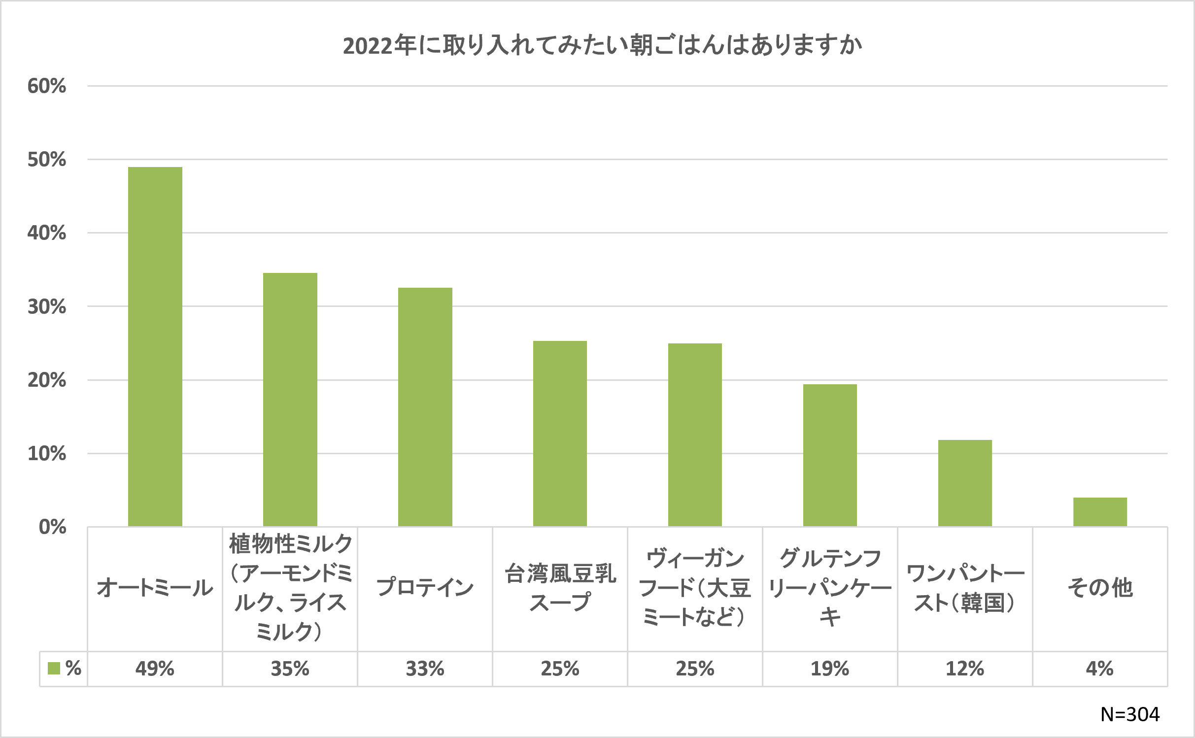 今回の調査では、コロナ禍で5人に1人が朝時間の過ごし方が変わり、朝型生活にシフトしたり運動を始めたなど、新しい習慣を実践しています。また食事面においては、今後取り入れたい朝食として1位が「オートミール」になり、次いで「植物性ミルク」「プロテイン」など朝から手軽に取り入れられるヘルシーなものが上位を占める結果になりました。引き続き健康への関心が高まっていくのではないでしょうか。
