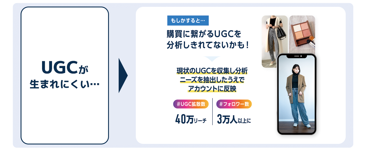 広告出稿後のアクション・コメントデータ等の成果を分析し、アクションが伸びる・再生数が増加する・UGCが増える等、成果につながるコンテンツの方向性を診断します。